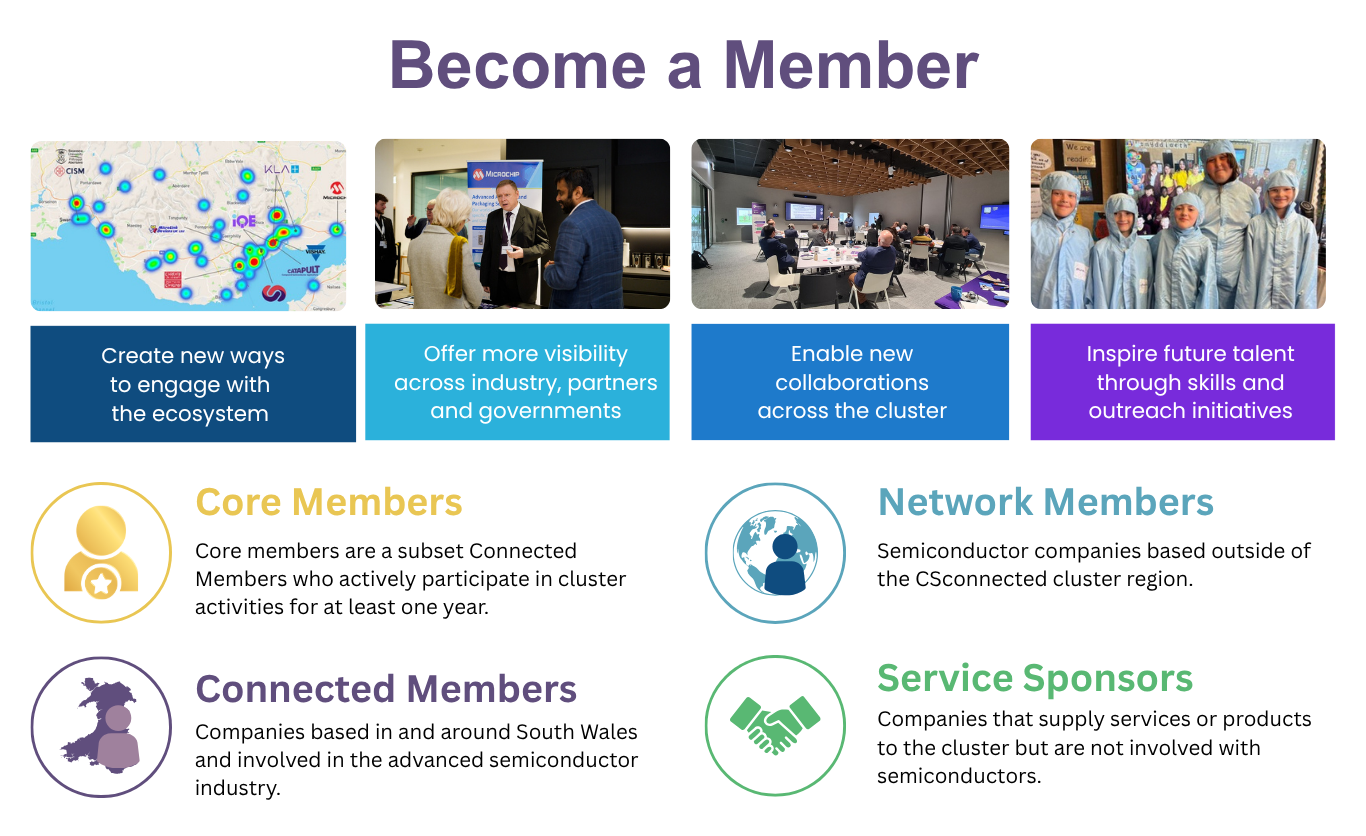 We recognise that political borders are largely meaningless when we consider local collaboration. While the compound semiconductor cluster is firmly established in South Wales, there are organisations ‘around’ our political boundaries which have deeper links to the cluster. If an organisation meets two of the following four criteria, we will consider them for Connected or Core Member status, and they can participate accordingly: